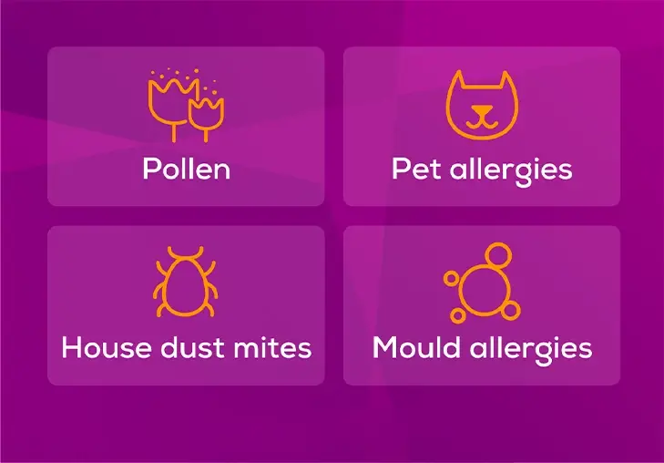 - Hayfever (seasonal allergic rhinitis) and year round allergies (perennial allergic rhinitis). Symptoms include runny, itchy, blocked nose, sneezing and itchy, watery, red eyes.